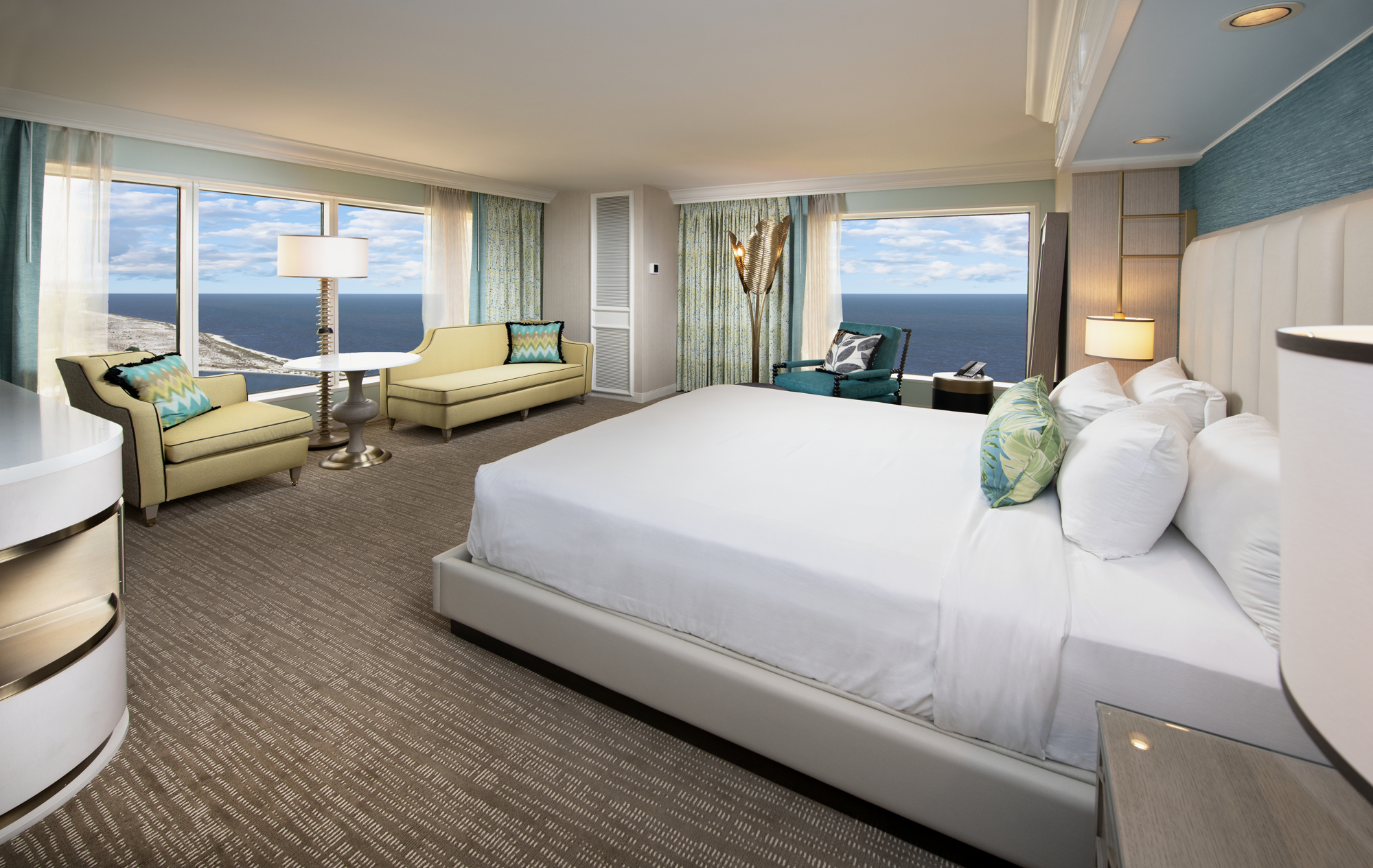 MGM Resorts Design & Development collaborated with interior design firm PGAL of Las Vegas, NV to create the newly remodeled rooms that were inspired by the Coastal Mississippi lifestyle. With a playful color palette that pays homage to local sunrises, sunsets and reflections of the water, the finishes are reminiscent of the seashore and incorporate details of driftwood, high gloss surfaces, coral and aqua blue.